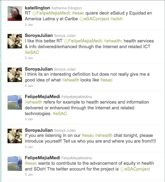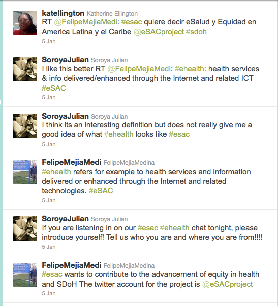 First up, the folks over at PAHO’s Public eHealth Innovation and Equity in Latin American and the Caribbean (eSAC) have been hosting another Twitter Chat tomorrow evening (Thursday, Jan 12th) at 7pm EST; #esac. If you missed last week’s chat, I’m including a screenshot of a portion of it. If you have any questions related to health inequities/health disparities in Latin America and the Caribbean, and the role of ICTs (management information services, data sharing networks, web 2.0/3.0 applications such as blogs and mobile apps) in combating those, this is the people to connect with.